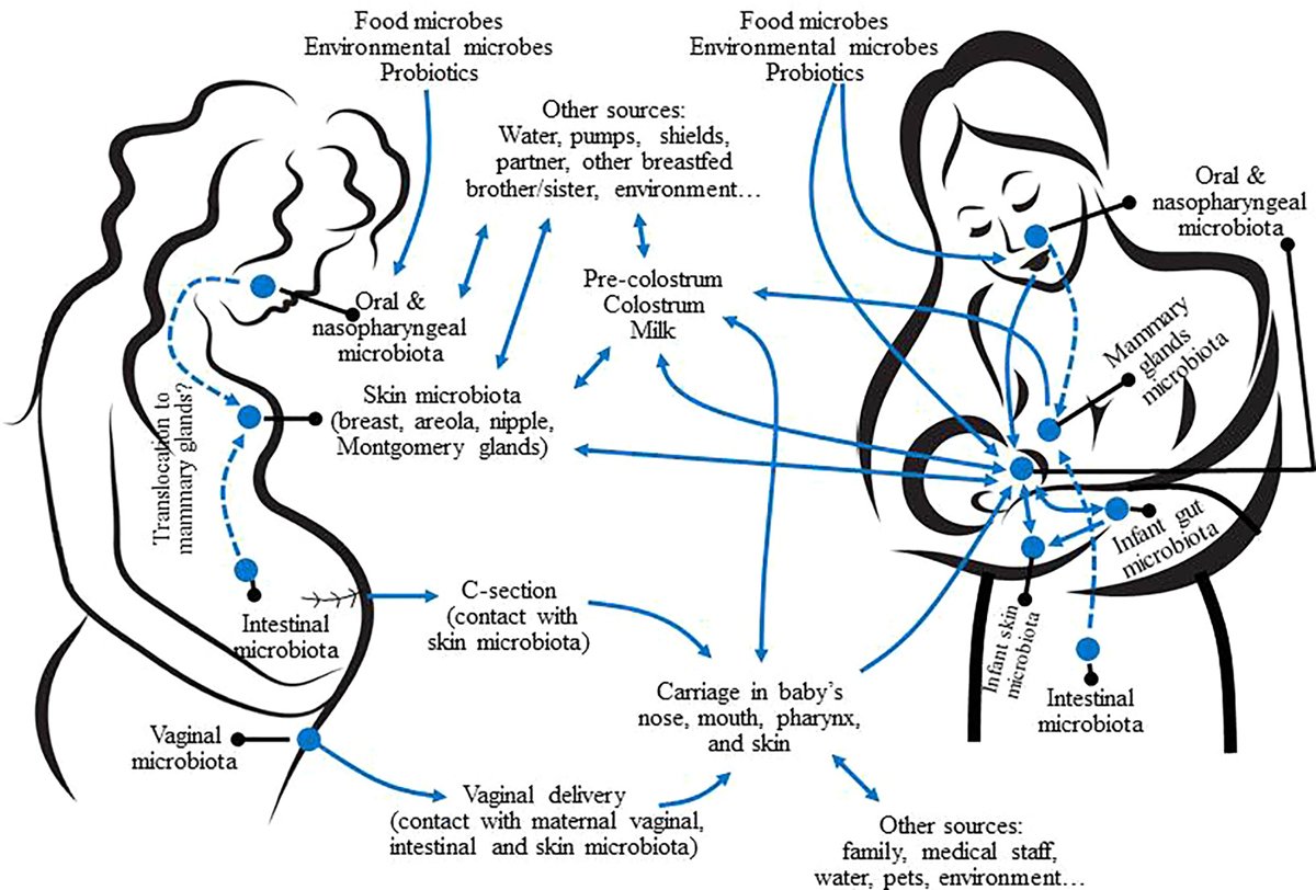 Մարդու կուրծքի կաթին մէջ առկայ պաքթերիաներու ծագումը անյայտ է: Այնուամենայնիւ, ուսումնասիրութիւնները ցոյց տուած են, որ անոնց առկայութիւնը ուղղակիօրէն կապուած է նախածննդեան շրջանին հետ, որ կը սկսի յղիութեան երրորդ եռամսեակին եւ կը շարունակուի ծնունդէն ետք, ու կ՛երկարի դիեցման ամբողջ շրջանին: Կուրծքի կաթի կենսամանրէի ենթադրուած ծագումներէն են մօր մաշկի կենսամանրէն, նորածինի բերանի խոռոչէն` ծծելու ընթացքին, ինչպէս նաեւ մօր ստամոքս-աղիքային համակարգէն, որ կապուած է նաեւ մօր կուրծքին: