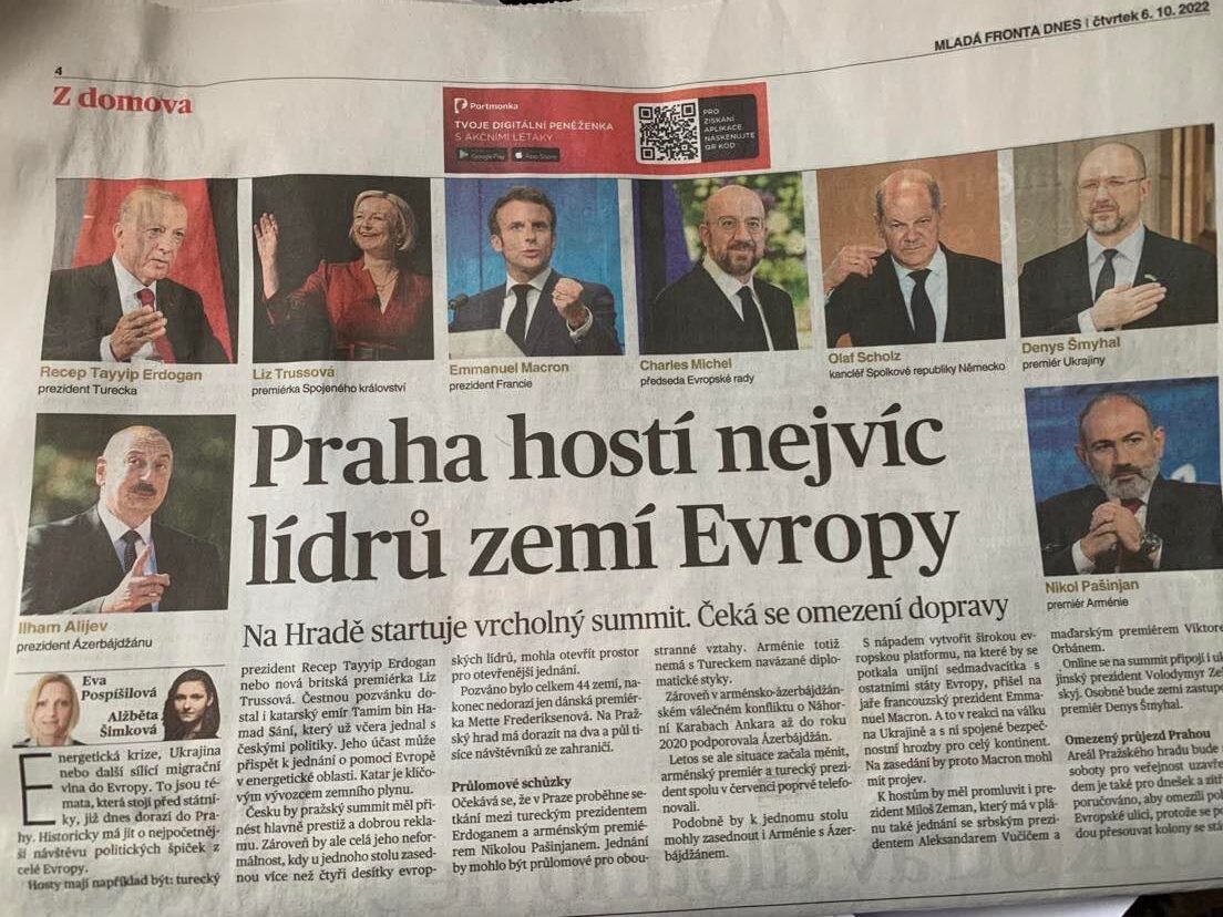 Լուսանկարում` չեխական ազդեցիկ «Տնես» օրաթերթը տպագրել է գագաթնաժողովի կարեւոր հիւրերի լուսանկարները, այդ թւում` Էրտողանի, Ալիեւի եւ Փաշինեանի