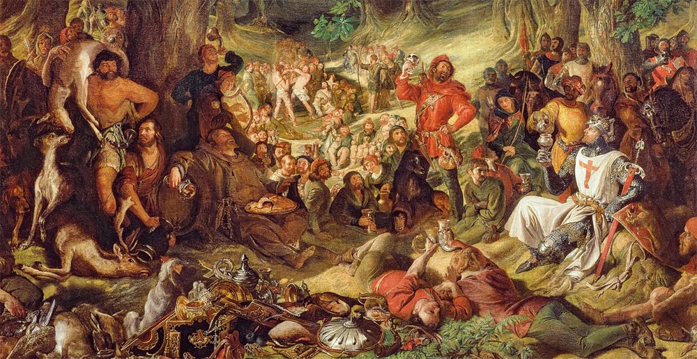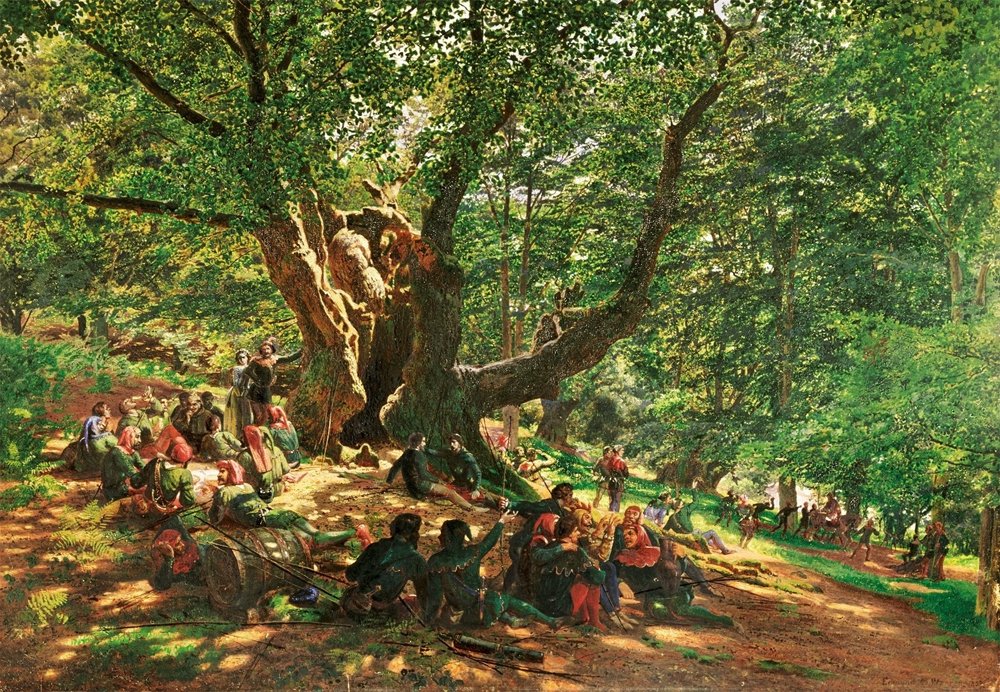 Անգլիացի գեղանկարիչ Էտմոնտ Ճորճ Ուորընի 1859 թուականի նկարը` Ռոպին Հուտը եւ անոր մարդիկը Շերվուտ անտառին մէջ: Մեծ ծառի տակ կանաչ անտառին մէջ հաւաքուած օրինազանցները կ՛արտացոլացնեն հին Անգլիոյ շարք մը իտէալականացուած խորհրդանիշներ, որոնք ստեղծուած են դարերու ընթացքին: