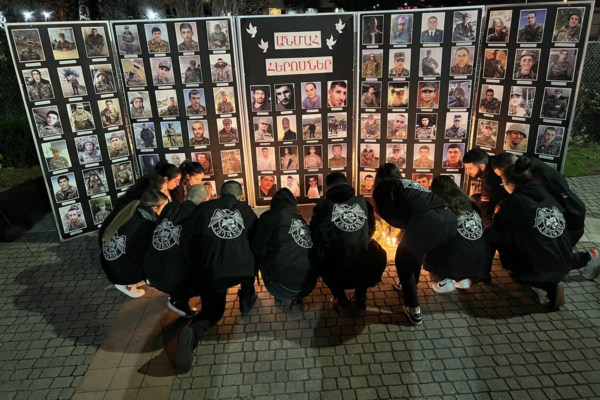 Միասնութեան հանրահաւաքի աւարտին ներկաները մոմեր վառելով` յարգեցին արցախեան գոյամարտերու եւ մասնաւորապէս 44-օրեայ պատերազմի ընթացքին ինկած հերոսներուն յիշատակը: