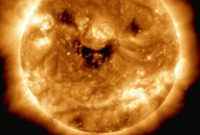2010 թուականէն ի վեր ՍՏՕ ամերիկեան անջրպետամեքենան կը դառնայ երկրագունդին շուրջ` արեւը ուսումնասիրելու համար: 26 հոկտեմբերին ան հաճելի նկար մը կրցած է առնել արեւէն. նկարին մէջ կարծէք արեւը կը ժպտի: Անոր վրայի աչքերը եւ բերանը կազմող սեւ բիծերը փոթորիկի շրջաններ են: Արեւային քամիները դէպի անջրպետ կը ղրկեն իր ելեկտրականութեամբ լեցուած փոշիներ, նման` երկրագունդին վրայ փոթորիկի մը ընթացքին յառաջացած ելեկտրականութեան: