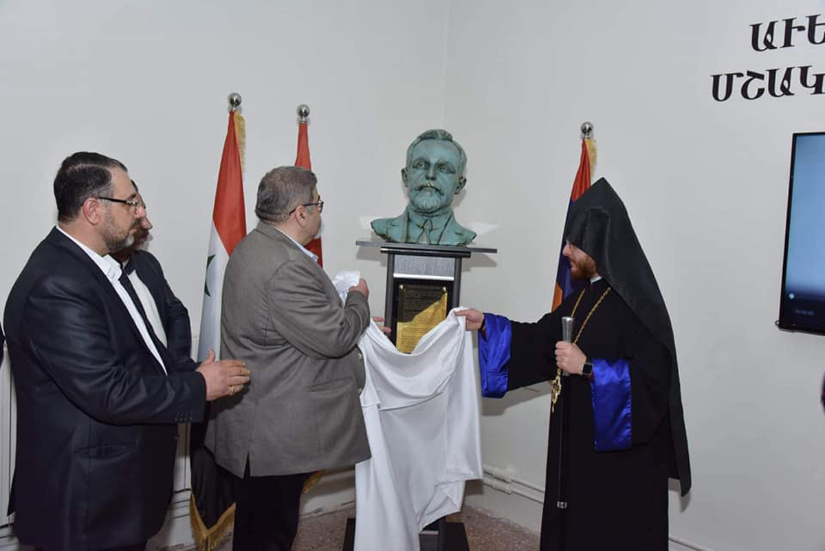 Այնուհետեւ ներկաները ուղղուեցան դէպի կեդրոնի սրահ, ուր քողազերծուեցաւ Աւետիս Ահարոնեանի կիսանդրին: Գամիշլիի «Աւետիս Ահարոնեան» մասնաճիւղի վարչութեան ատենապետ Յակոբ Պարսումեան ներկաները ծանօթացուց կեդրոնի գրասենեակներուն եւ տարուող ընթացիկ աշխատանքին, ինչպէս նաեւ` կեդրոնի «Աճարեան» լսարան-գրադարանին, ուր այս տարի ընթացք առաւ հայագիտականի առցանց դասընթացքը: