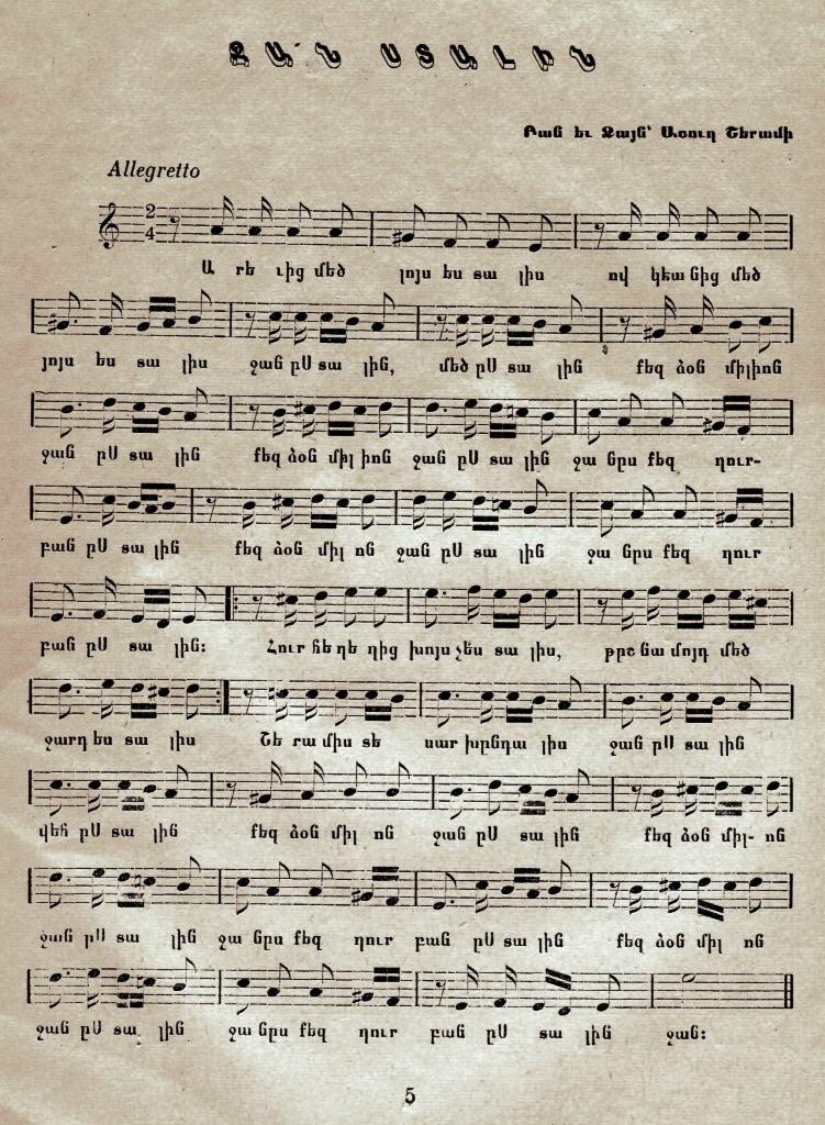 Քանի մը օր առաջ գրադարանիս մէջ գիրք մը կը փնտռէի, երբ ձեռքս անցաւ բարակուկ, հազիւ 20 էջնոց երգարան-պրակ մը, որ լոյս տեսած է 1945-ին, Հալէպ: Ընթերցողս քիչ ետք կրնայ հետեւցնել, թէ հրատարակողը ի՜նչ որակի հայրենասէր մըն էր): Անոր մէջ կար երգ մը, որուն պատճէնը կ՛ընկերանայ տողերուս: Խորագիրը` «Ջա՜ն, Ստալի՛ն»: Յիշողութեանս մէջ արթնցան հեռո՜ւ յիշատակներ: Մանկութեանս, Հալէպի մէջ, կարգ մը ընտանիքներու յարկին տակ լսած եմ Հայաստանէն «ներածուած» այդ երգը: Հաւանաբար այլ գաղութներու մէջ ալ երգած են զայն: