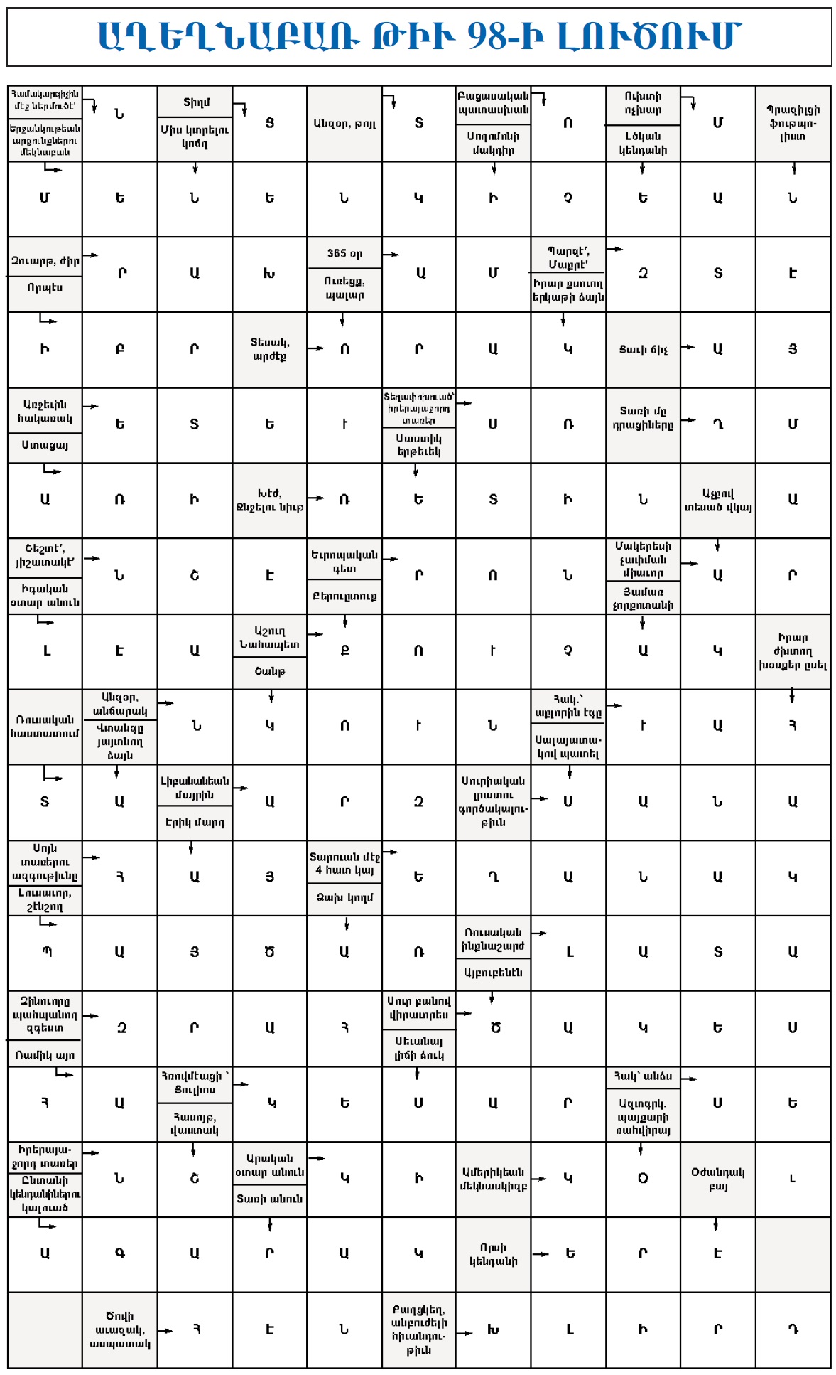 Պատրաստեց՝ <strong>ՆԱՆՕՐ ԳՈՉՈՒՆԵԱՆ-ԹԱՇՃԵԱՆ</strong> <a href="https://www.aztagdaily.com/wp-content/uploads/2023/02/agheghnapar-tiv-98-loudzoum.jpg"><img class="aligncenter size-full wp-image-572003" src="https://www.aztagdaily.com/wp-content/uploads/2023/02/agheghnapar-tiv-98-loudzoum.jpg" alt="" width="1177" height="1934" /></a>