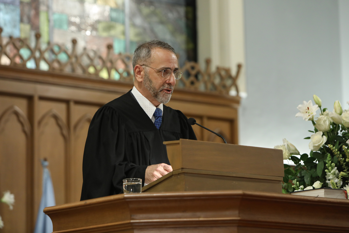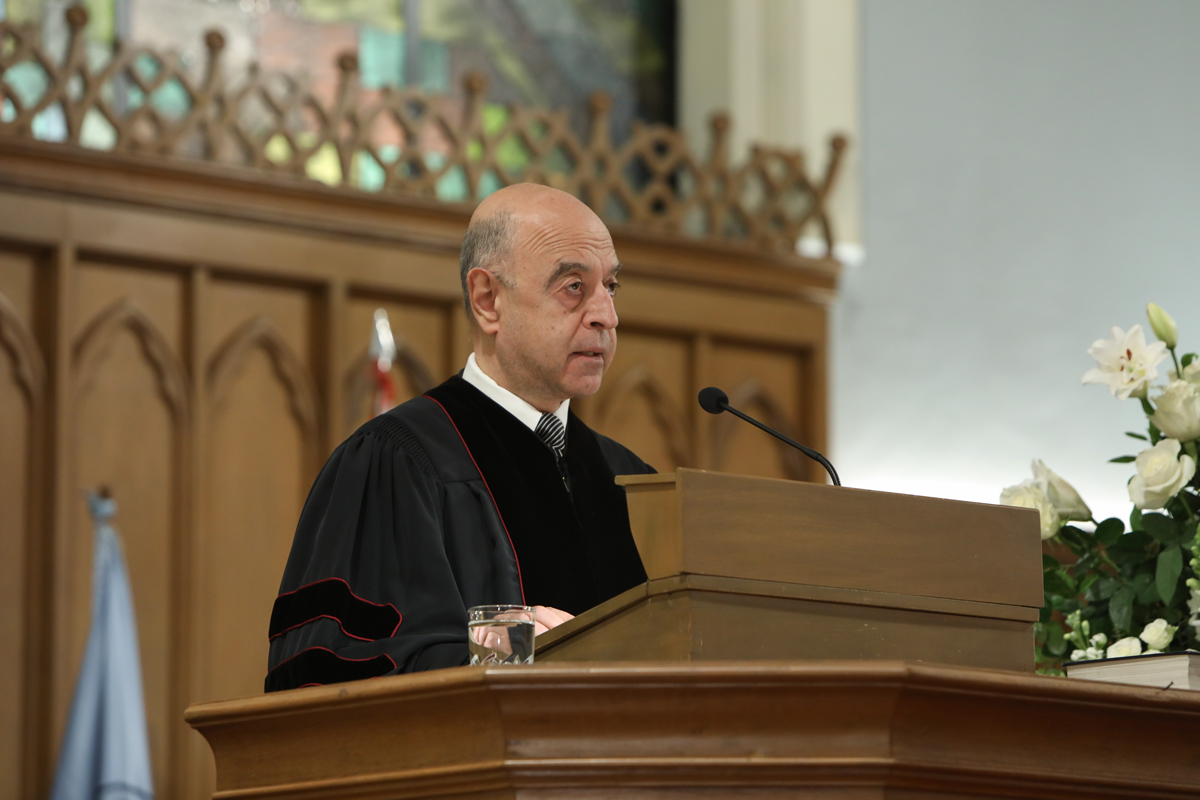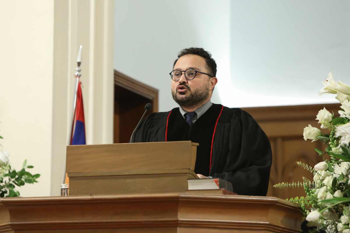 «Բարի է իմ հոգւոյս» երգէն վերջ խօսք առաւ Հայ աւետարանական Ա. եկեղեցւոյ հովիւ պատ. Ժիրայր Ղազարեան: Ան նկատել տուաւ, որ արդի ընկերութեան մէջ ոմանք մարդոցմէ շնորհք գտնելը բոլորովին անկարեւոր կը համարեն` աւելցնելով, որ Աստուծոյ շնորհքին մէջ մնալու ձգտումին մէջ, որ ամէնօրեայ ճիգ կը պահանջէ, ընդհանրապէս ջանքերը պակսած են: Ան յայտնեց, որ մարդոցմէ շնորհք գտնելը մերժող, մարդկային վերաբերմունքը արհամարհող մարդը կը նախընտրէ կղզիանալ, մեկուսանալ եւ անհաղորդ պահել ինքզինք: Սակայն, հաւաքական կեանքը այդպէս չի զարգանար, մանաւանդ եթէ կրթական հաստատութիւն է: Ան ըսաւ, որ դպրոցը կղզի մը չէ, այլ` շրջագծուած է մարդոցմով, նաեւ հայ եկեղեցիով, որ իր զաւակները դպրոցէն կը ղրկէ աշխարհ մը, ուր գոյատեւելը կը պահանջէ հաւատք, յոյս ու սէր: