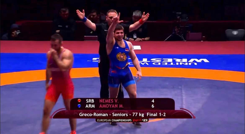 77 քկ դասակարգի մրցումի աւարտականին, Եւրոպայի եւ աշխարհի ախոյեան Ամոյեան, որ մրցեցաւ Եւրոպայի ախոյեան, սերպ Վիքթոր Նեմեսի դէմ, արձանագրեց 4-1 արդիւնքով յաղթանակ մը: