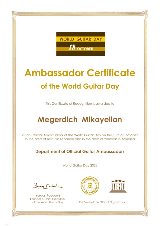 Տեղեկացնենք նաեւ, որ Կիթառի միջազգային օրուան առիթով կազմակերպուած մրցոյթին մասնակցութեան դիմումնագիրներ ներկայացուցած են 112 երկիրներէ մասնակիցներ, իսկ Հայաստանն ու Լիբանանը ներկայացնող Մկրտիչ Միքայէլեանին գլխաւորած խումբը տեղ գրաւած է մասնակիցներու առաջին ութ խումբերու ցանկին մէջ եւ յաջողութեամբ անցած է աւարտական փուլ:
