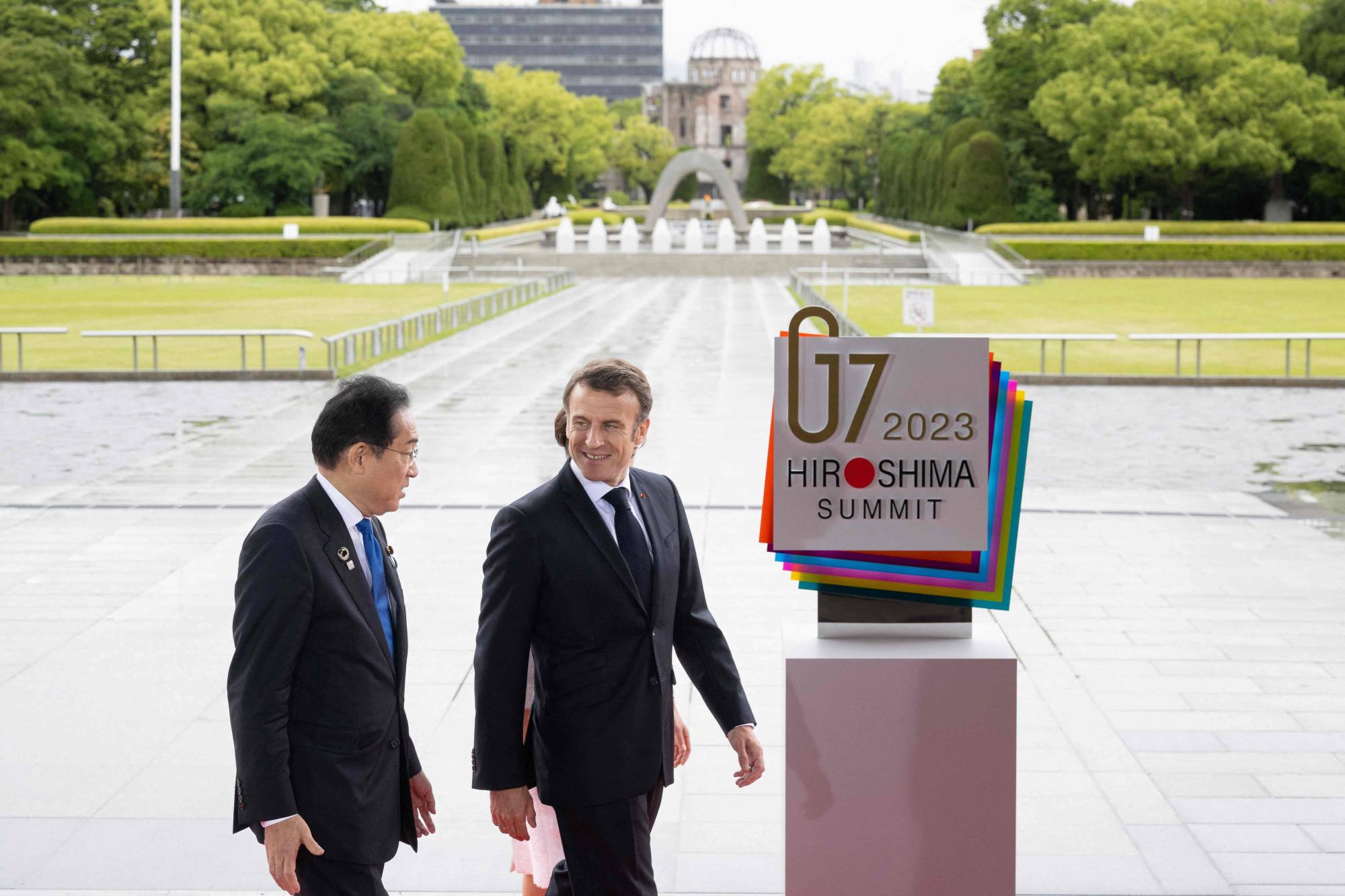 Japan’s Prime Minister Fumio Kishida (L) welcomes France’s President Emmanuel Macron at the Peace Memorial Park as part of the G7 Leaders’ Summit in Hiroshima on May 19, 2023. (Photo by Jacques Witt / POOL / AFP)