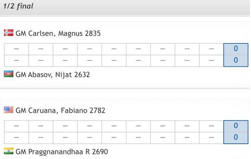 Կիսաւարտականի միւս մրցումին, միջազգային դասաւորման պարագլուխի դիրքին վրայ գտնուող նորվեկիացի Մակնուս Քարլսըն (2835), պիտի մրցի ազրպէյճանցի Նիժաթ Ապպասովի դէմ (2632):
