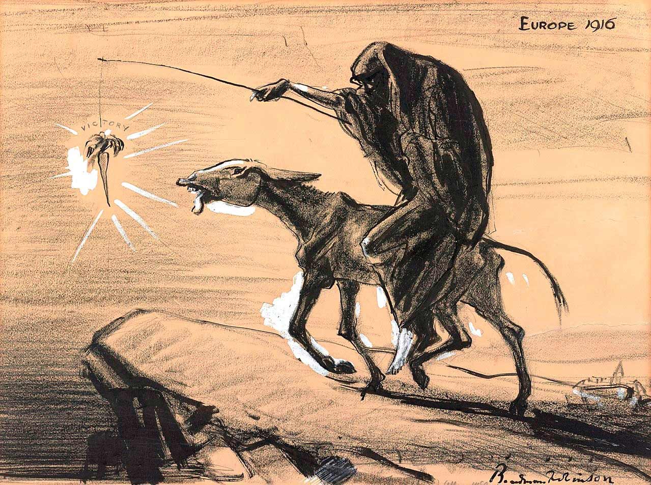 Ընթերցողս պիտի նկատէ, որ սա բաւական հին է (1916) եւ կը պատկերէ Ա. Աշխարհամարտի օրերու Եւրոպայի վիճակը: Շարժիլ մերժող յամառ իշուն քիթին դիմաց ստեպղին մը կախելով` զայն քալել հարկադրելու մասին առակը շատ հին է: Հոս, սակայն, նկարողը տարբեր մեկնաբանութիւն մը աւելցուցած է սկզբնական, այլապէս դրական գաղափարին: Դիտողը կը տեսնէ, որ էշը շարժման մէջ դնողը (եւ բացայայտ է, որ ան ճիւաղանման արարած մըն է) չորքոտանին հասցուցած է անդունդի մը եզրին: Քանի մը քայլ եւս, եւ…