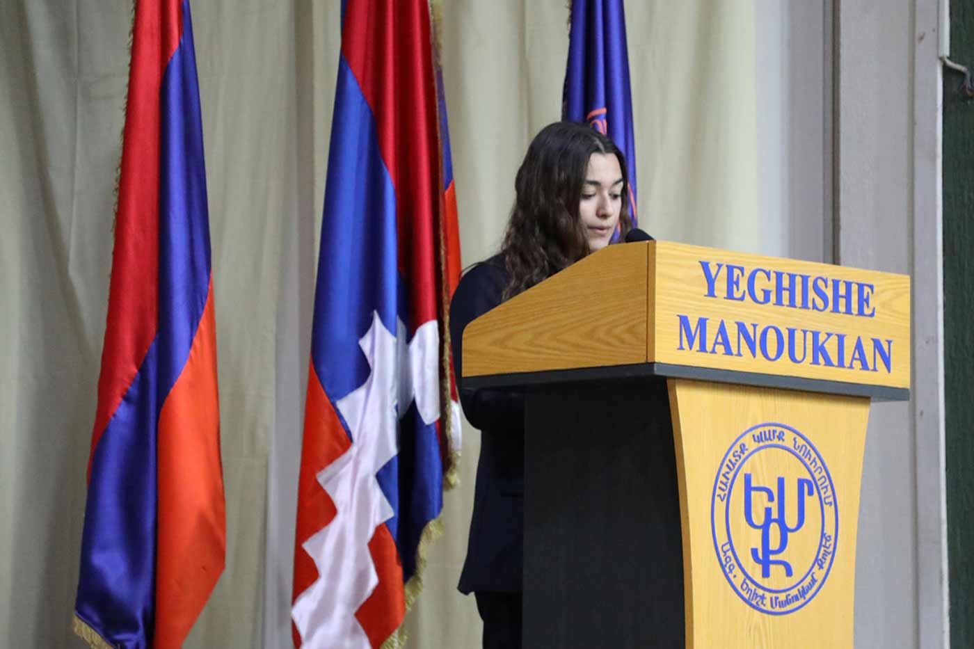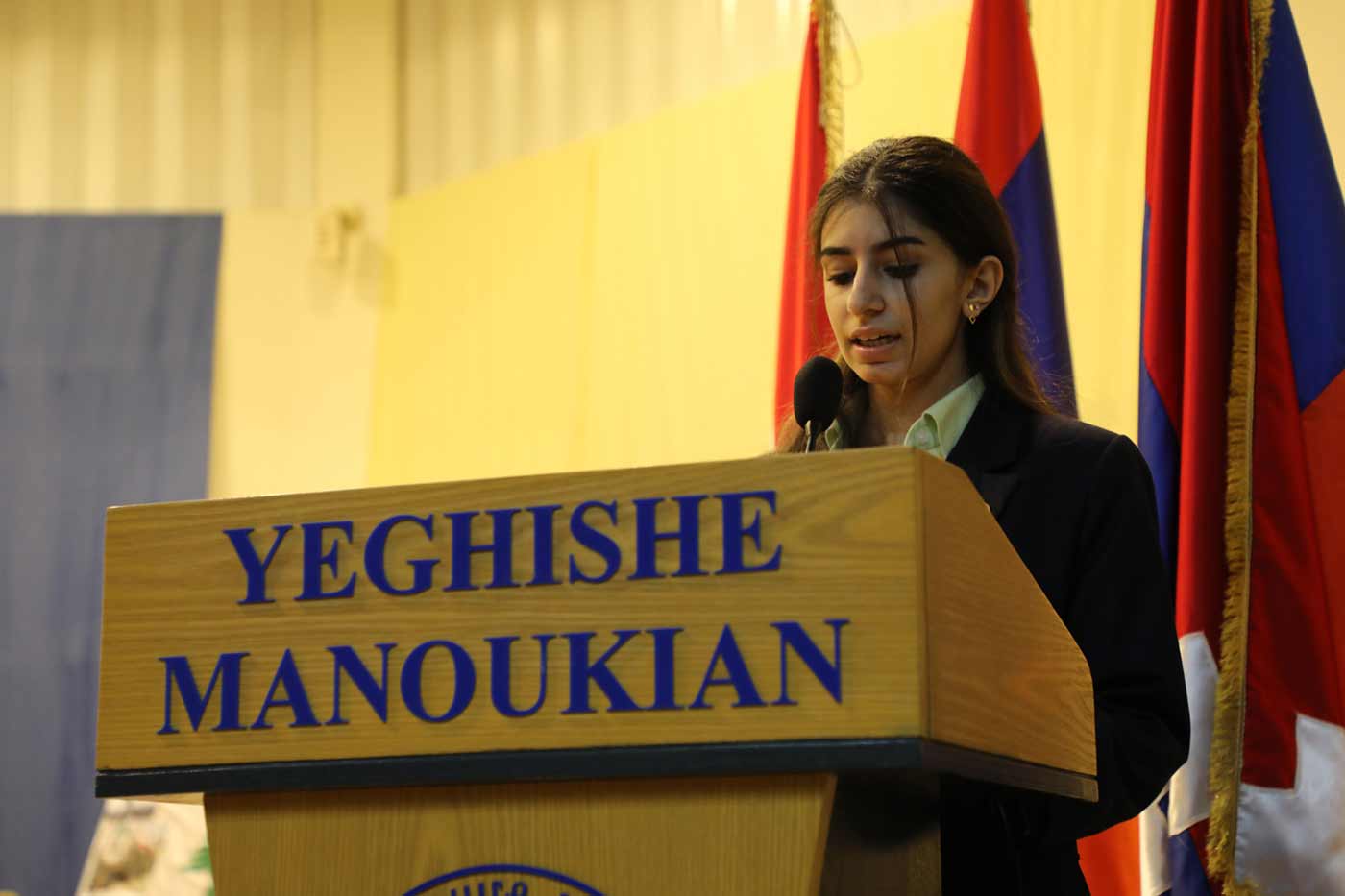 Ազգային Եղիշէ Մանուկեան վարժարանի աշակերտ Ռէյնա Խալիլ արաբերէնով արտասանած բացման խօսքին մէջ նկատել տուաւ, որ հայրենիքի անկախութիւնը ազատութեան խորհրդանիշ է, որուն համար շատ սուղ գին վճարեցինք: Ան շեշտեց, որ մենք Ցեղասպանութիւն ապրած, տառապած, գոյութեան համար ամէն զոհողութիւն ի գործ դրած ազգի թոռներն ենք եւ կը մնանք մեր խոստումին վրայ, աւելցնելով, որ մենք հաւատարիմ ենք Լիբանանին, որովհետեւ պայքարող եւ դիմագրաւող ազգ ենք եւ կը խոստանանք պահպանել Լիբանանի հողին իւրաքանչիւր հատիկը եւ միասնաբար, քով-քովի քալելով` պիտի իրականացնենք արդարութիւնը , ազատութիւնը եւ անկախութիւնը: