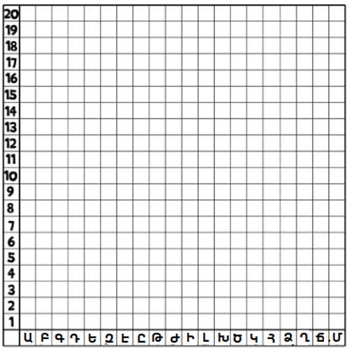 – Դեղին – Դ (11), Ը (10), Ի (11), Լ (9), Ծ (12):