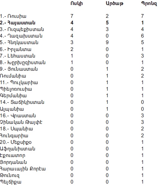 Վերջին օրուան մրցումներէն ետք, ոսկի մետալներ շահեցան Տիգրան Յովսէփեան (50 քկ), Արգիշտի Յակոբեան (66 քկ) եւ Ալպերթ Յարութիւնեան (75 քկ): Նախապէս Վաղարշակ Քէյեան (48 քկ) շահած էր ոսկի մետալ մը: