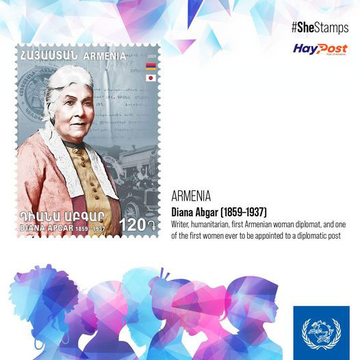 Համաշխարհային նամակաբաշխութեան միութեան 150-ամեակին առիթով տեղի ունեցող «Կիները դրոշմաթուղթերու մէջ» (She Stamps) արշաւի ծիրէն ներս հրապարակուած է «Տիանա Աբգար» դրոշմաթուղթի վերաբերեալ տեղեկութիւն եւ դրոշմաթուղթին նկարը: