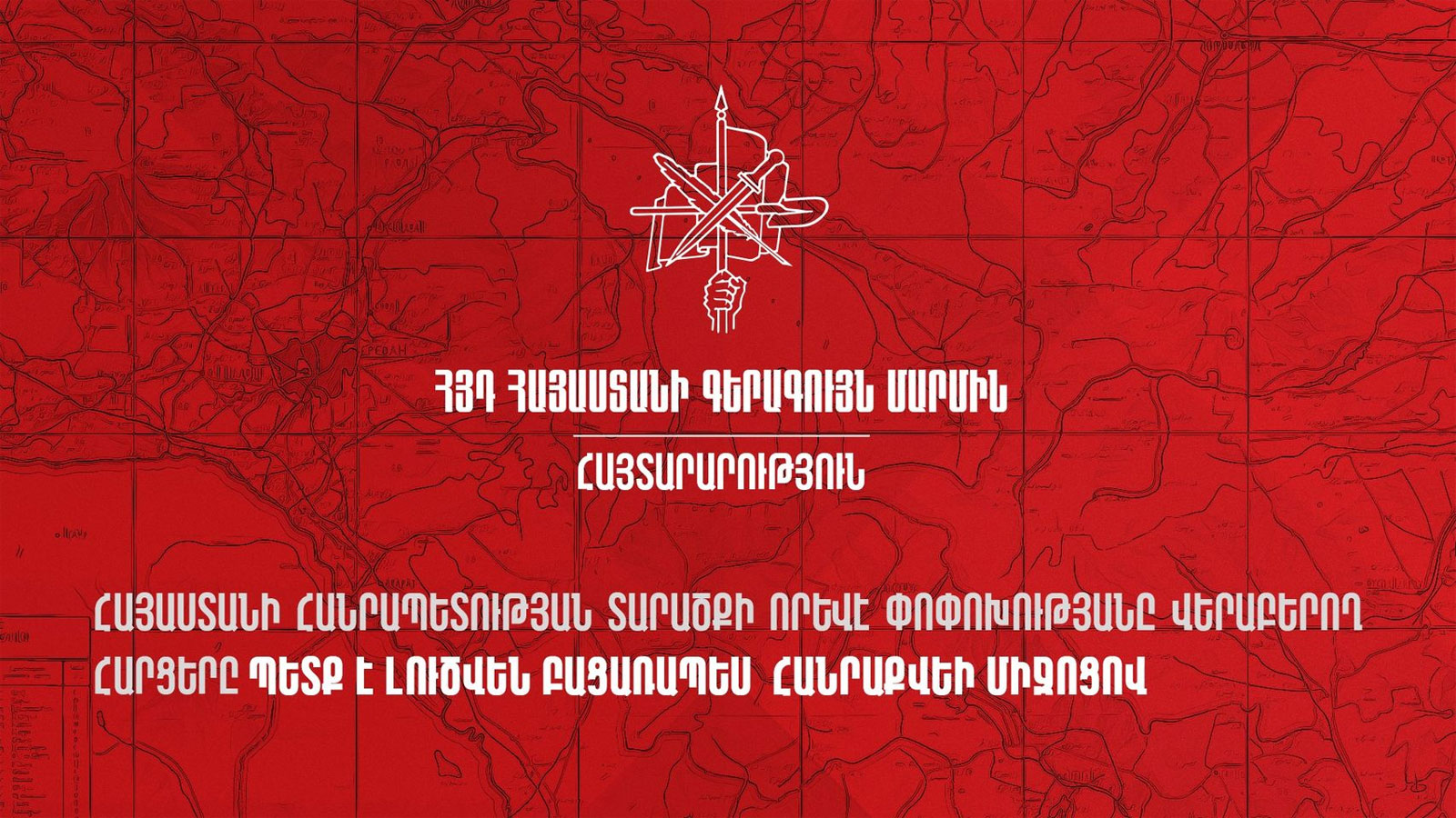 Ըստ այդմ, յայտարարում ենք եւ զգուշացնում Նիկոլ Փաշինեանին ու գործընթացում ներգրաւուած բոլոր անձանց, առանց հանրաքուէի Հայաստանի Հանրապետութեան ինքնիշխան իրաւազօրութեան ներքոյ գտնուող որեւէ տարածքի փոփոխութիւն (փոխանցում այլ պետութեան) կամ այդ ուղղութեամբ իրականացուած որեւէ գործողութիւն ոչ միայն առ ոչինչ է, այլ նաեւ համարւում է Հայաստանի Հանրապետութեան սահմանադրական կարգի եւ պետութեան անվտանգութեան դէմ ուղղուած առանձնապէս ծանր յանցագործութիւն, որը պատժւում է ընդհուպ ցմահ ազատազրկմամբ: