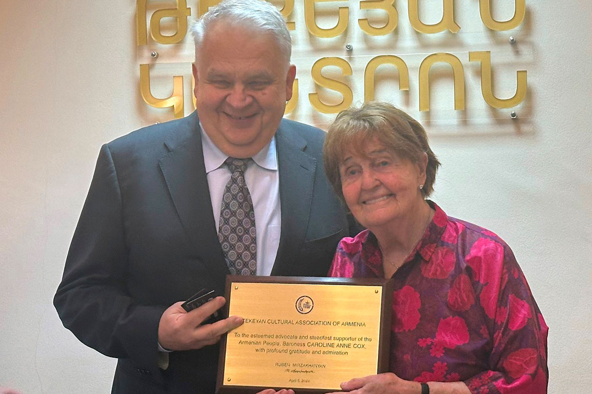 Հայաստանի «Թէքէեան» մշակութային միութեան նախագահ Ռուբէն Միրզախանեան պարոնուհի Քերոլայն Քոքսին յանձնեց ՀԹՄՄ պատուոյ-յուշատախտակ` հայ ժողովուրդի յարգարժան եւ անսասան աջակիցին` խորին երախտագիտութեամբ եւ հիացմունքով: