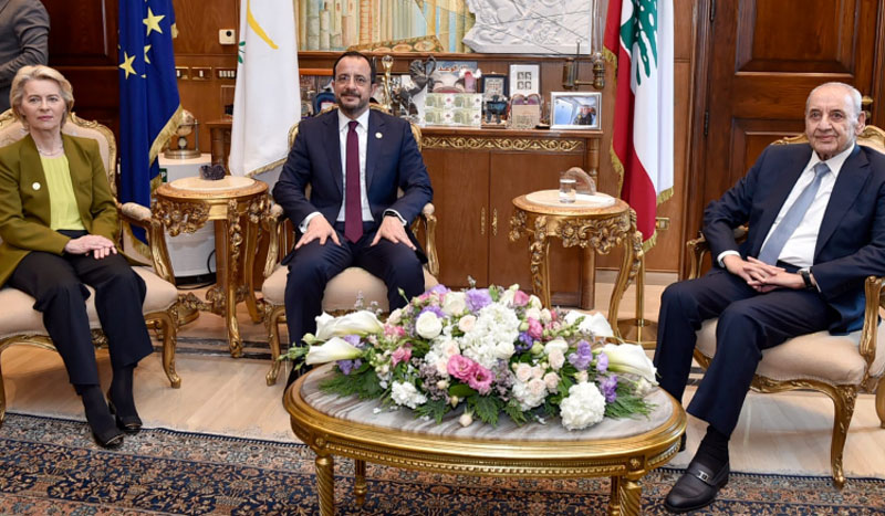 Խորհրդարանի նախագահ Նեպիհ Պըրրի երէկ Այն Թինէի մէջ ընդունեց Եւրոպական յանձնաժողովի նախագահ Ուրսուլա Ֆոն Տեր Լեյենը, Կիպրոսի նախագահ Նիքոս Խրիսթոտուլիտեսը եւ անոնց ընկերակցող պատուիրակութիւնը: Ներկայ էին Կիպրոսի արտաքին գործոց նախարար Քոսթանիանոս Քոմպոս, Լիբանանի մէջ Կիպրոսի դեսպան Մարիա Թէոտոսիու, Լիբանանի մէջ Եւրոպական Միութեան դեսպան Սանտրա Տիւ Վալ, արտաքին գործոց եւ արտերկրի լիբանանցիներու հարցերու խորհրդարանական յանձնախումբի նախագահ, երեսփոխան Ֆատի Ալամէ, Պելիճքայի մէջ Լիբանանի դեսպան Ֆատի Հաժ Ալի եւ Պըրրիի տեղեկատուական հարցերու խորհրդական Ալի Համտան: