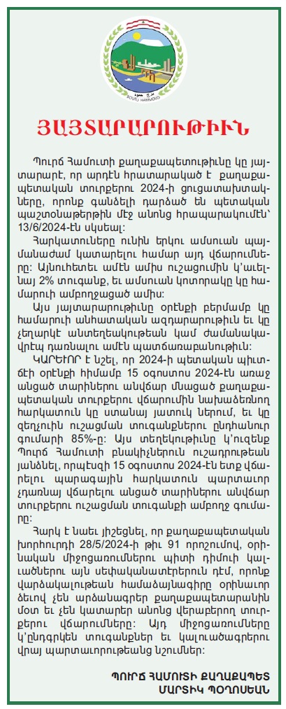 <a href="https://www.aztagdaily.com/wp-content/uploads/2024/07/Bourj-Hammoud-Municipality_7824.jpg"><img class="aligncenter size-full wp-image-619448" src="https://www.aztagdaily.com/wp-content/uploads/2024/07/Bourj-Hammoud-Municipality_7824.jpg" alt="" width="409" height="1013" /></a>