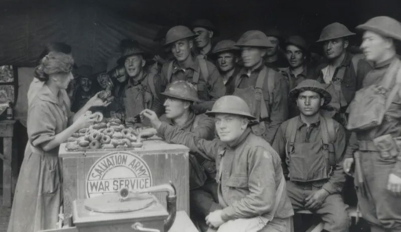 Այս ոչ կառավարական կազմակերպութեան կապերը տոնաթին հետ շատ հին են: 1917 թուականին, համաշխարհային Ա. պատերազմին ընթացքին, Սալվէյշըն արմիէն խումբ մը կին կամաւորներ կը ճամբորդեն Ֆրանսա` խնամելու համար վիրաւորուած զինուորները: Իրենց տուներէն հեռու այս խումբերուն տրամադրութիւնները փոխելու համար կամաւորները կ՛որոշեն իրենց տրամադրութեան տակ ունեցած սահմանափակ նիւթերը` ալիւր, շաքար, ձէթ, գործածել տոնաթ պատրաստելու համար: