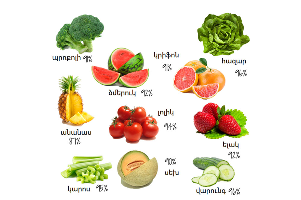 Բ.- Ջուրով հարուստ ուտելիքներ ուտել: Ջուրի պակասէ չտառապելու համար այլ միջոցներէն մէկն ալ ջրոտ ուտելիքներ ուտելն է: Անոնց կարգին են պտուղներն ու բանջարեղէնները, ինչպէս` ձմերուկ, սեխ, հատապտուղներ, պղպեղ, հազար, վարունգ: