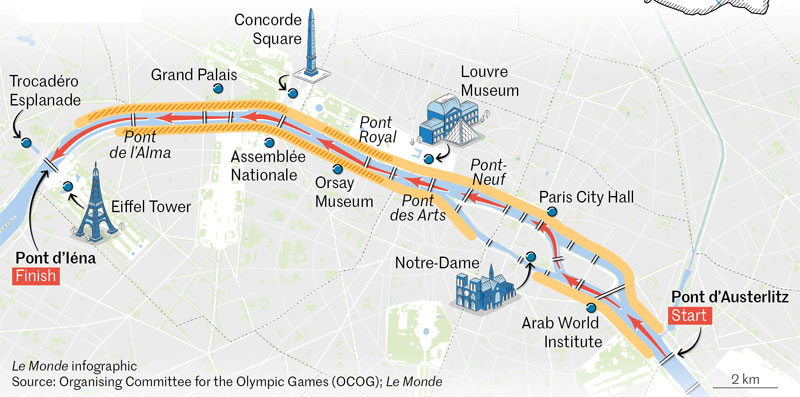 Տողանցքը սկսաւ Օսթերլիցի կամուրջէն: Ան իր ճամբան շարունակեց դէպի արեւմուտք` կտրելով 6 քիլոմեթր, անցնելով պատմական կամուրջներէ եւ խորհրդանշական կոթողներու եւ շէնքերու առջեւէն, ինչպէս` Նոթըր-Տամ Քաթետրալը, Լուվր թանգարանը եւ Կրան Փալէն: Ամբողջ ճամբուն ընթացքին հանդէսներ տեղի կ՛ունենային նաեւ կամուրջներուն վրայ, ուր պարողներ գեղարուեստական յայտագիր կը ներկայացնէին: