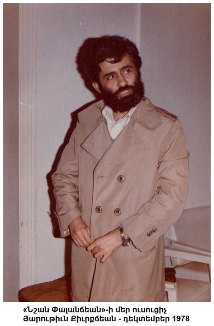 Պրն. Քիւրքճեանին աշակերտ ըլլալու բախտը ունեցած եմ «Նշան Փալանճեան» ճեմարանին մէջ, թէ՛ հայերէնի եւ թէ՛ արտադասարանային՝ «Պատի թերթ»-ի, «Կանթեղ»-ի եւ «Ջահակիր»-ի (Ճեմարանի տարեկան պարբերաթերթերու) աշխատանքներու ընթացքին: