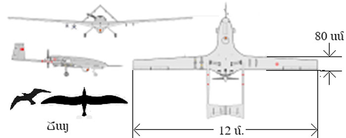 ԱԹՍ-ները ի հարկէ թռչուններ չեն, բայց անոնց թեւերու «կերպարանային համեմատութիւնը»` (aspect ratio = երկայն/լայնք) հիմնուած գծանկարին վրայ, կատարուած չափումի մօտաւորապէս հաւասար է ( 600 սմ/80 սմ) = 7,5-8, ինչ որ նման է սաւառնող թռչուններու, ինչպէս` ճայեր: Տես կողքի գծանկարը: