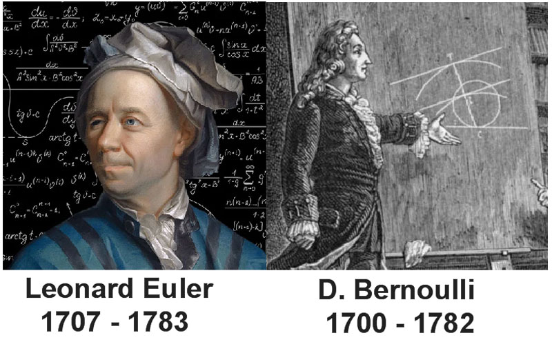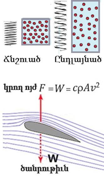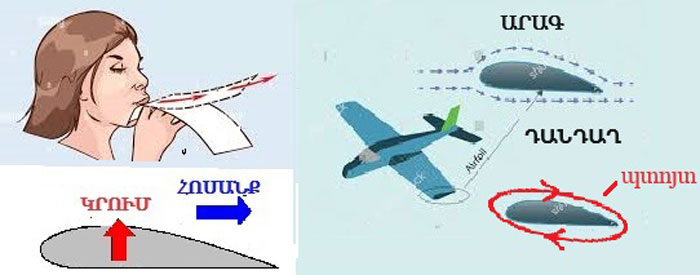 Հոսագիտութիւն (fluid dynamics) (3).- Ծանօթ առած է, որ ջուրի հոսանքը իրեն «կը քաշէ» լուղորդը: Ընթերցողը թերեւս անձամբ զգացած է այդ բաց ծովու մէջ: Երեւոյթին բացատրութիւնը առնչուած է թռիչքի բնագիտութեան: Կարելի է կատարել պարզ փորձ մը: Թուղթի շերտ մը բռնել, ինչպէս պատկերը ցոյց կու տայ, եւ փչել: Պիտի տեսնէք, որ թուղթը կը շարժի դէպի վեր, այսինքն դէպի օդի հոսանք: Կան նման բազմաթիւ այլ դիւրին փորձեր (4): Նկատել, որ թուղթի ձեւը նման է օդանաւի թեւի վերի մակերեսին: Թեւի վերեւէն անցնող օդը նոյն ժամանակի ընթացքին աւելի երկայն ուղեգիծ ունի, քան` վարէն անցնողը, ուրեմն աւելի արագ է: Այդ կը պատճառէ դէպի վեր գործող ուժ մը, որ կը կրէ օդանաւը: Անգլերէն եզրն է «lift» (բարձրացում, կրում): Քանի որ վերի մակերեսին վրայ օդը աւելի արագ է, քան` ներքեւի, թուաբանական առումով թեւին շուրջ տեղի կ՛ունենայ թեւին հետ յառաջ շարժող «պտոյտ» (vortex լատիներէն vortere կամ vertere կը նշանակէ դառնալ, պտտուիլ): Օդը հոսուն, տարածուն ձեւափոխուող նիւթ է: Առ այդ, անոր շարժումը կառավարող օրէնքները շատ աւելի բարդ են, քան, օրինակ, փոքրիկ գնդակի մը: Այդ տարազները անգլիացի Նիւթոնի հիմնադրական Երկրորդ օրէնքի հրատարակումէն (1687) շուրջ կէս դար ետք ձեւաւորեցին Օյլըր եւ մասնաւորաբար Պերնուլլի, որուն ընտանիքը տուած է ոչ նուազ քան ութ գիտնականներ:
