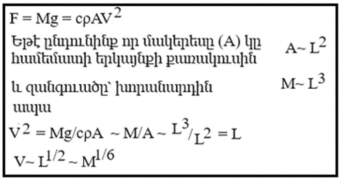 Ինչպէս նախապէս անդրադարձած եմ, հանճարեղ Կալիլէօ այդ յայտնաբերած էր դարեր առաջ (7): Ծաւալի եւ մակերեսի յարաբերութեան ցուցարկուն աւելի մօտ է 4/3-ի, քան 3/2-ի (M~L^4 A~L^3 M~L^(4/3)): Այդ կը նշանակէ, որ արագութեան եւ զանգուածի յարաբերութեան ցուցարկուն աւելի մօտ է 1/8-ի (0,125), քան` 1/6-ի (0,167): Հետեւաբար «Պայրաքտար» կրնայ թռչիլ 35 մ/երկ արագութեամբ (< վերը հաշուարկուած 50): Չափումները կը թելադրեն, որ այդ մօտաւորապէս 0,13 է (7, 8):