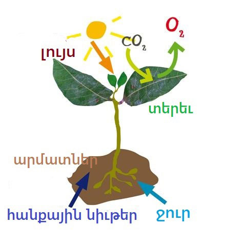 Ֆոթոսենթեզիսի ժամանակ օդին մէջ ծառին տերեւները «կը ծծեն» արեւուն լոյսը եւ բնածխական կազը (CO2): Գետնին մէջ անոր արմատները կը հաւաքեն ջուրը եւ հանքային աղերը (հողին մէջ գտնուող սնունդ հայթայթող նիւթեր): Այս տարբեր տարրերով ծառը շաքար կը շինէ սնանելու, ապրելու եւ աճելու համար: Երբ ֆոթոսենթեզիսի գործողութիւնը կ՛աւարտի, ան դուրս կ՛արձակէ թթուածինը, որ մեր շնչած կազն է: