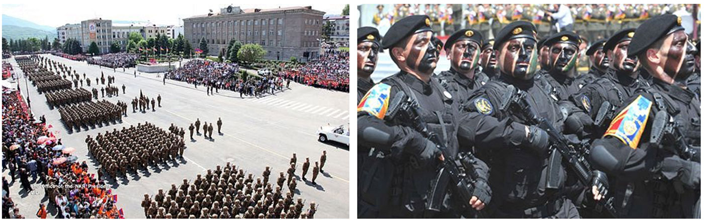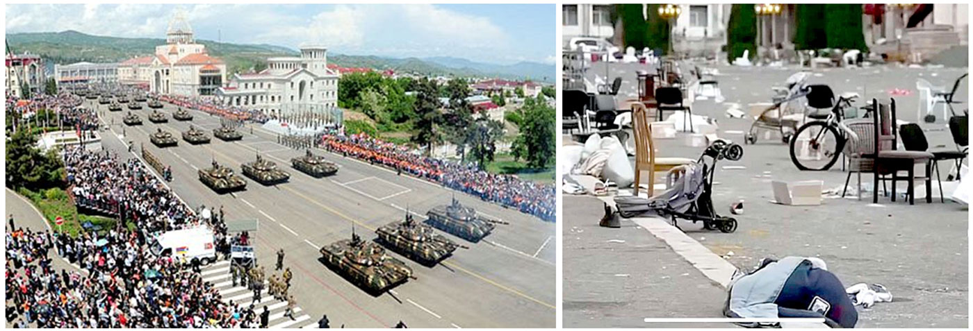 3. Արցախի անկախութեան զօրահանդէս, 9 մայիս 2013, Ստեփանակերտի Վերածնունդի հրապարակին վրայ: 4. Ազրպէյճանի ցեղասպանութեան զոհ` Արցախի ժողովուրդը շտապօրէն մահուան սպառնալիքի տակ կը լքէ իր տուները, հողերը եւ ունեցուածքը, Արցախն ու Վերածնունդի յաղթանակի զօրահանդէսներու հրապարակը: