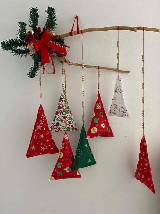 Բ.- Պատի զարդ մը, որուն համար անհրաժեշտ են` մէկ-երկու ճիւղ, ժապաւէն, տօնածառ խորհրդանշող կտորէ եռանկիւն կախազարդեր, ուլունքներ եւ այլն…