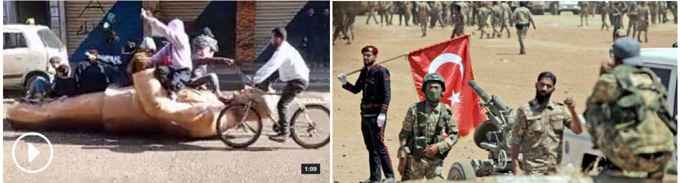 1. Նախագահ Հաֆեզ Ասատի տապալած արձանը կը քաշկռտուի փողոցը: 2. Սուրիոյ հիւսիսը, Այն Իսայի թրքական զօրակայանի մը մէջ, զինեալներ: