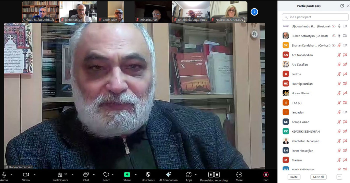 «Ազդակ»-ի 73-րդ առցանց լսարանը տեղի ունեցաւ հինգշաբթի, 23 յունուար 2024-ին, Պէյրութի ժամով 18:00-ին: «Թուրքիոյ արտաքին քաղաքականութեան նորագոյն միտումները» նիւթին մասին դասախօսեց թրքագէտ, ակադեմիկոս փրոֆ. Ռուբէն Սաֆրաստեան: Լսարանը վարեց «Ազդակ»-ի ելեկտրոնային բաժնի աշխատակից Մինաս Հանս Քէհեան: