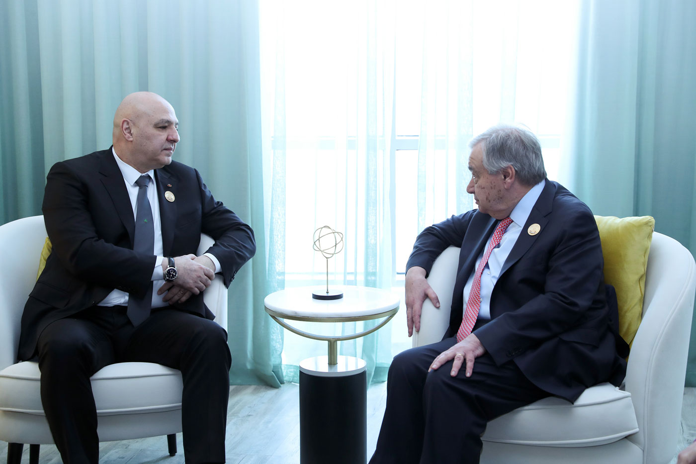 Կութիերես հանդիպումէն ետք լրագրողներուն յայտնեց. «Առիթը օգտագործեցի հանդիպում ունենալու նախագահ Աունի հետ, որպէսզի խոր զօրակցութիւնս յայտնեմ լիբանանցի ժողովուրդին: Ես շատ ուրախ եմ նոր կառավարութեան կազմութեան գծով եւ խորհրդարանի վստահութեան արժանանալուն, ներկայիս իր տնտեսութեան ու հասարակութեան վերականգնման համար ազդու բարեկարգումի քաղաքականութեան նկատմամբ Լիբանանի ցուցաբերած յանձնառութեան համար: Ներկայիս պահանջուածը այն է, որ Լիբանանի տարածքային ամբողջականութիւնը յարգուի, եւ պէտք չէ, բացի ՖԻՆԻՒԼ-էն, որեւէ օտար ուժ անոր վրայ մնայ»: