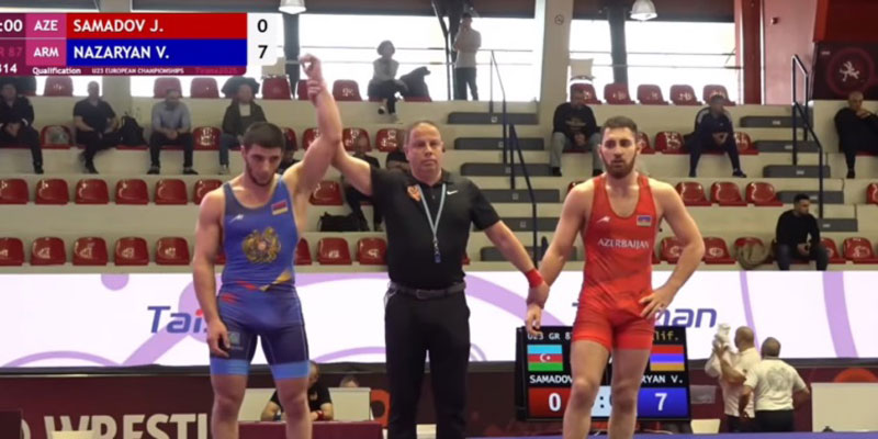 87 քկ կշիռի Հայաստանի ներկայացուցիչ Վիգէն Նազարեան 7-0 արդիւնքով ջախջախիչ յաղթանակ տարաւ իր ազրպէյճանցի մրցակիցին վրայ: