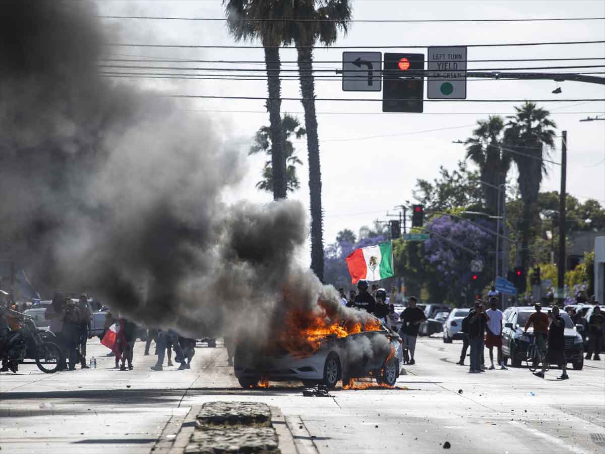 Լոս Անճելըսի մէջ անկարգութիւններու 3-րդ օրուան ընթացքին գաղթականներու ձերբակալման քաղաքականութեան ընդդիմացող ցուցարարներ ինքնաշարժներ հրկիզեցին եւ ոստիկանութեան հետ բախումներ ունեցան: