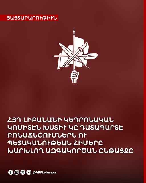 ՀՅԴ Լիբանանի Կեդրոնական կոմիտէն խստիւ կը դատապարտէ հայրենի քաղաքական դաշտը բռնաճնշելու եւ իրաւապահ ու դատական մարմինները բռնատիրութեան հաստատման գործիք դարձնելու ընթացքը, իր անվերապահ զօրակցութիւնը յայտնելով այսօր հալածանքներուն թիրախ դարձած քաղաքական գործիչներուն, ի մասնաւորի՝ Հայաստանի մեր ընկերներուն եւ մարմիններուն, ինչպէս նաեւ ազգային արժէքներու դարաւոր պահապան Հայ առաքելական եկեղեցիին։