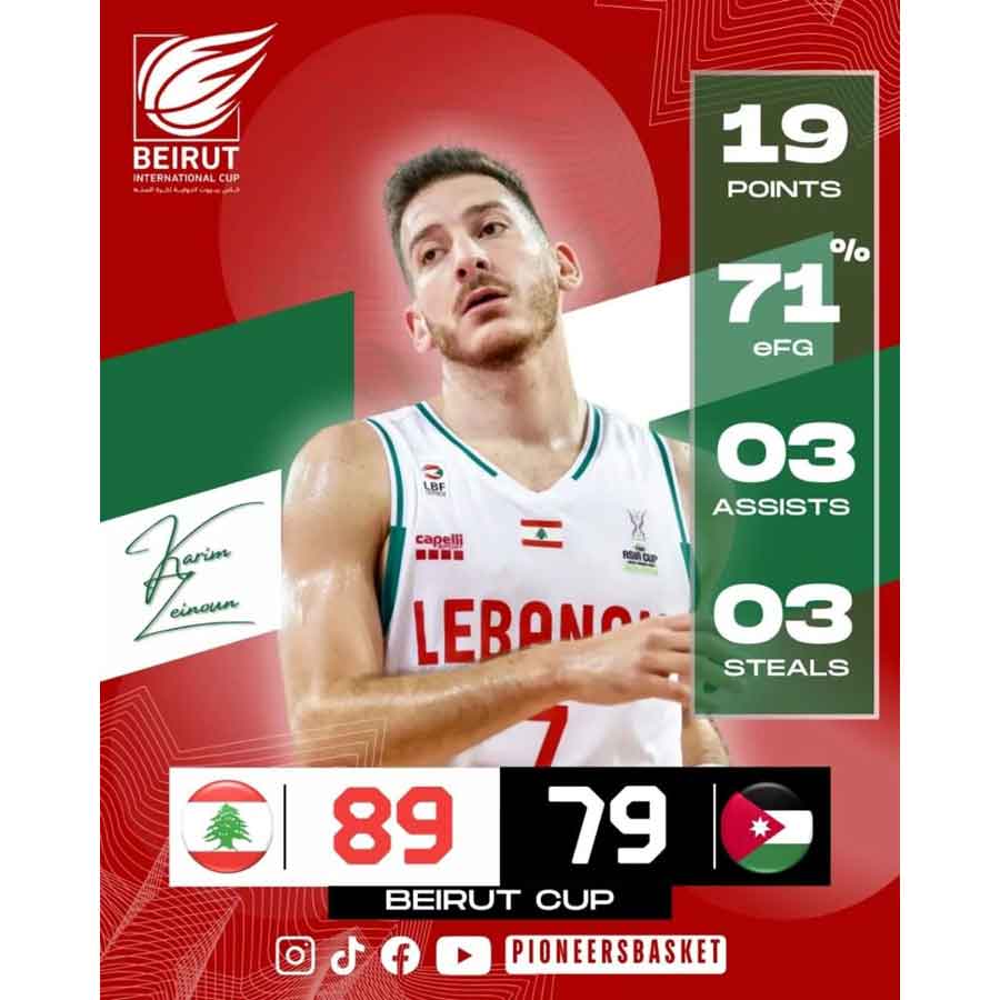 Եուսեֆ Խայյաթ («Եոյօ») 25 կէտ նշանակեց, իսկ Քարիմ Զէյնուն 19 կէտ աւելցուց: Ժիհատ Խաթիպ (14 կէտ), Տետրիք Լուըն (12 կէտ եւ 9 ռիպաունտ), Ամիր Սէուտ (8 կէտ), Ժերար Հատիտեան (4 կէտ), Մարք Խուրի (4 կէտ) եւ Քարլ Զամաթա (3 կէտ) նշանակեցին Լիբանանի 89 կէտերը` Յորդանանին 10 կէտի առաւելութեամբ յաղթելով: