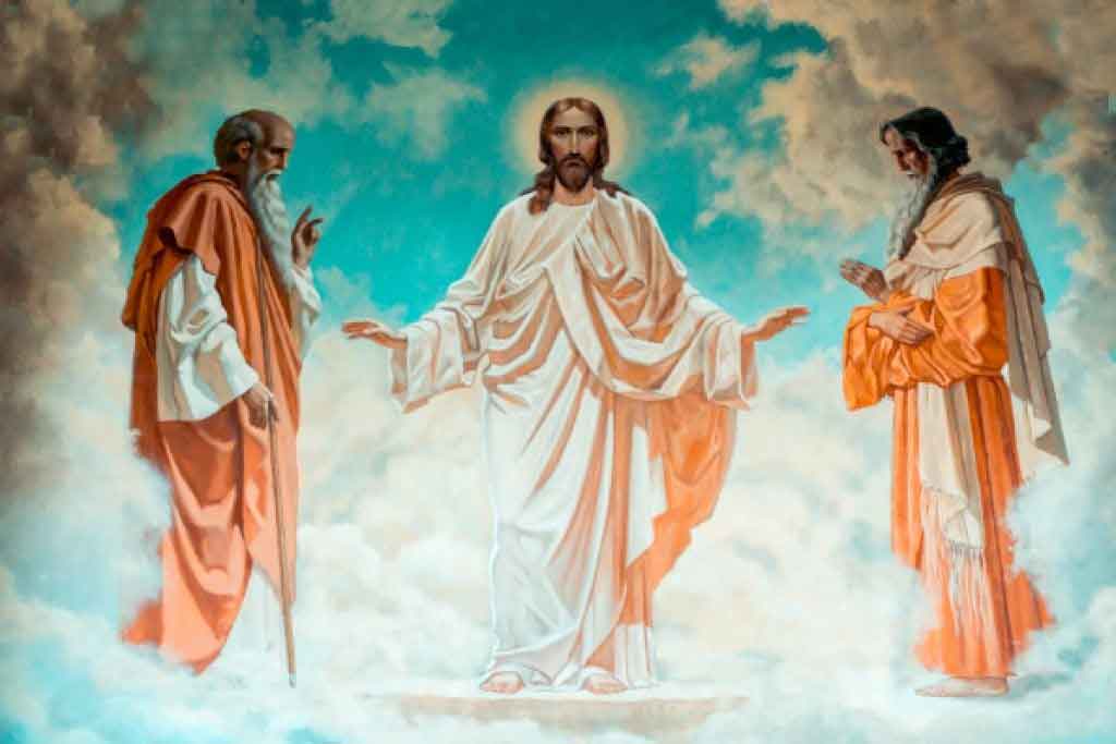 Նոյն պահուն երկինքէն երեւաց Սուրբ Երրորդութիւնը. Հայրը` ձայնով, Սուրբ Հոգին` լուսաւոր ամպով, իսկ Որդին` պայծառակերպուած: Դժոխքէն եկաւ Մովսէս, իսկ դրախտէն` Եղիա: