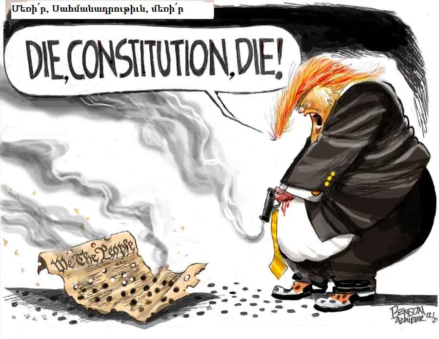 Եւ Փաշինեանն ու ՔՊ-ականները կը փորձեն ազգը համոզել, որ Սահմանադրութեան փոփոխութիւնը ազերիական պահանջէ չի բխիր, աւելի՛ն, բանիւ եւ գործով կը գնդակահարեն սահմանադրութիւն եւ օրէնք, ճիշդ այնպէս, ինչպէս… Տանըլտ Թրամփ կ՛ընէ իր երկրին մէջ (ընկերացող երգիծանկարին մէջ Թրամփը կարելի է փոխարինել Փաշինեանով):