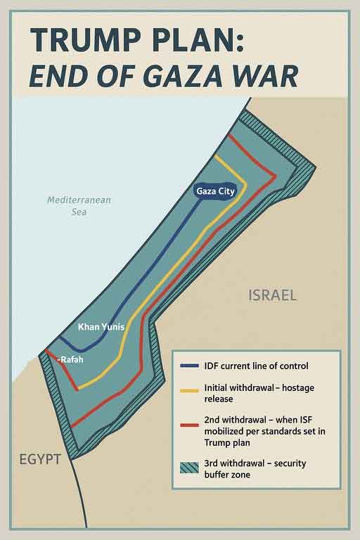 – Միացեալ Նահանգներն ու արաբ եւ միջազգային գործընկերները աշխատանք պիտի տանին կազմելու «կայունութեան միջազգային ուժ» մը, որ անմիջապէս Կազայի մէջ պիտի տեղակայուի` Յորդանանի եւ Եգիպտոսի հետ խորհրդակցաբար մարզելու եւ աջակցելու համար պաղեստինեան ոստիկանական ուժերուն, զէնքի մաքսանենգումը արգիլելու եւ Կազայի վերաշինութեան համար ապրանքներու հոսքը դիւրացնելու համար: