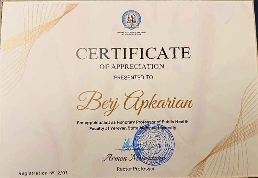 Հայաստանի հանրապետութեան պատուոյ հիւպատոս եւ Ֆրեզնոյի բժշկական առաքելութեան նախագահ Պերճ Աբգարեանին շնորհուած է հանրային աղողջապահութեան ոլորտին մէջ պատուոյ փրոֆեսէօրի կոչում։