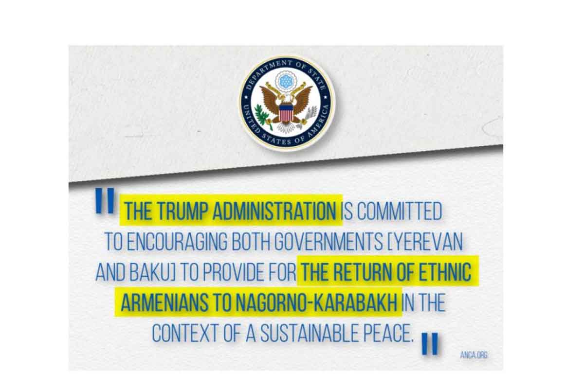 Քոնկրեսի հայկական խմբակցութեան ամիսներու շարունակական ճնշման եւ անդադար ամերիկահայութեան պաշտպանութեան ի պատասխան` Թրամփ-Վենսի վարչակազմը անցեալ շաբաթ աննախադէպ քայլով յայտարարեց, որ Միացեալ Նահանգները աշխուժօրէն կը խրախուսեն ինչպէս Երեւանը, այնպէս ալ Պաքուն ապահովելու «ազգութեամբ հայերու վերադարձը Լեռնային Ղարաբաղ», կը հաղորդէ Ամերիկայի Հայ դատի յանձնախումբը: