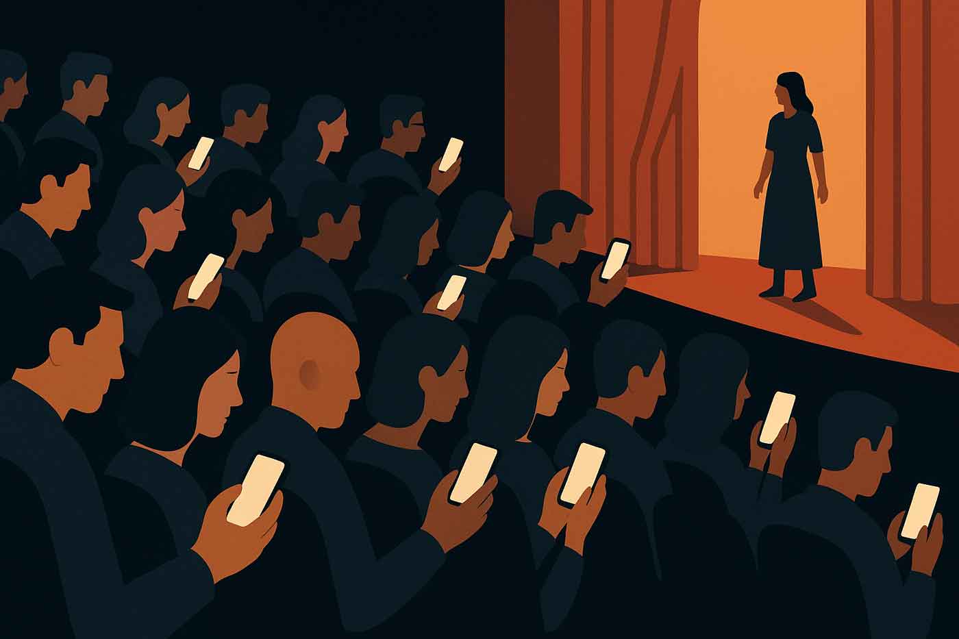 Եւ, օ՜, հեռաձայնի փայլող պաստառները. անարգութեան լուսաւոր փարոսներ, որոնք կը լուսաւորէին մութը, մինչ հանդիսատեսները կը ստուգէին իրենց պատգամները, կը թերթէին իրենց Ինսթակրամի էջերը եւ, ամէնէն «տպաւորիչ»-ը, աղջնակ մը ուղիղ եթերով կը հեռարձակէր ներկայացումը: Այո՛, Դիմատետրի կամ Ինսթակրամի մէկ անկիւնին մէջ գոյութիւն ունի թատերական գործի մը ակամայ-յառաջապահական տարբերակ մը, որ յագեցած է դեռահասի մը դողացող նկարահանումով, որ կը փաստագրէ մշակոյթը` միաժամանակ զայն ամբողջութեամբ անտեսելով:
