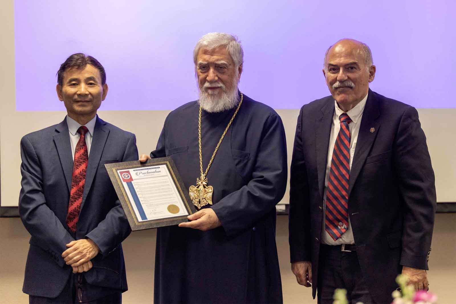 Աւարտին փոխնախագահը պարգեւատրեց վեհափառը համալսարանի բարձրագոյն շքանշանով, որ բացառաբար կը տրուի միջազգային վարկ վայելող անձնաւորութեանց: