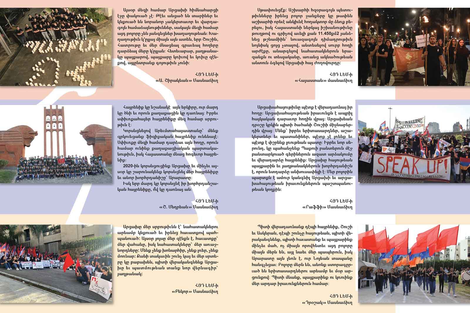Արցախահայութիւնը պէտք է վերադառնայ իր հողը: Արցախահայութեան իրաւունքն է ապրիլ հայկական դարաւոր հողին վրայ: Արցախեան դրօշը կրկին պիտի ծածանի Շուշիի միջնաբերդին վրայ: Մենք` իբրեւ երիտասարդներ, աշակերտներ եւ պատանիներ, պէտք չէ լռենք եւ պէտք է փշրենք լռութեան պատը: Իբրեւ նոր սերունդ` կը պահանջենք Պաքուի բանտերուն մէջ բանտարկուած գերիներուն ազատ արձակումը եւ վերադարձը հայրենիք: Արցախը հայութեան պայքարին եւ յաղթանակներուն խորհրդանիշն է, որուն վերատիրացումը անխուսափելի է: Մեր բոլորին պարտքն է ամուր կանգնիլ Արցախի եւ արցախահայութեան իրաւունքներուն պաշտպանութեան կողքին: