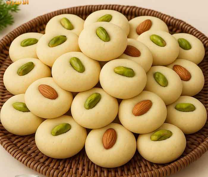 Խմորին երեսը ծածկել եւ 1 ժամ սառնարանը պահել: Մէկ ժամ ետք խմորէն փոքրիկ գնդակներ ձեւաւորել, ցուցամատով իւրաքանչիւրին կեդրոնը փոսիկ մը բանալ եւ Հալէպի պիստակ մը զետեղել: