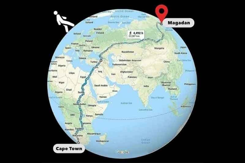 – Ցամաքի վրայ քալելով ամէնէն երկար հեռաւորութիւնը աւելի քան 22530 քմ է: Այս ձեւով կարելի է Ռուսիոյ Մակատան քաղաքէն քալելով երթալ մինչեւ Հարաւային Ափրիկէ` առանց ինքնաշարժ գործածելու: