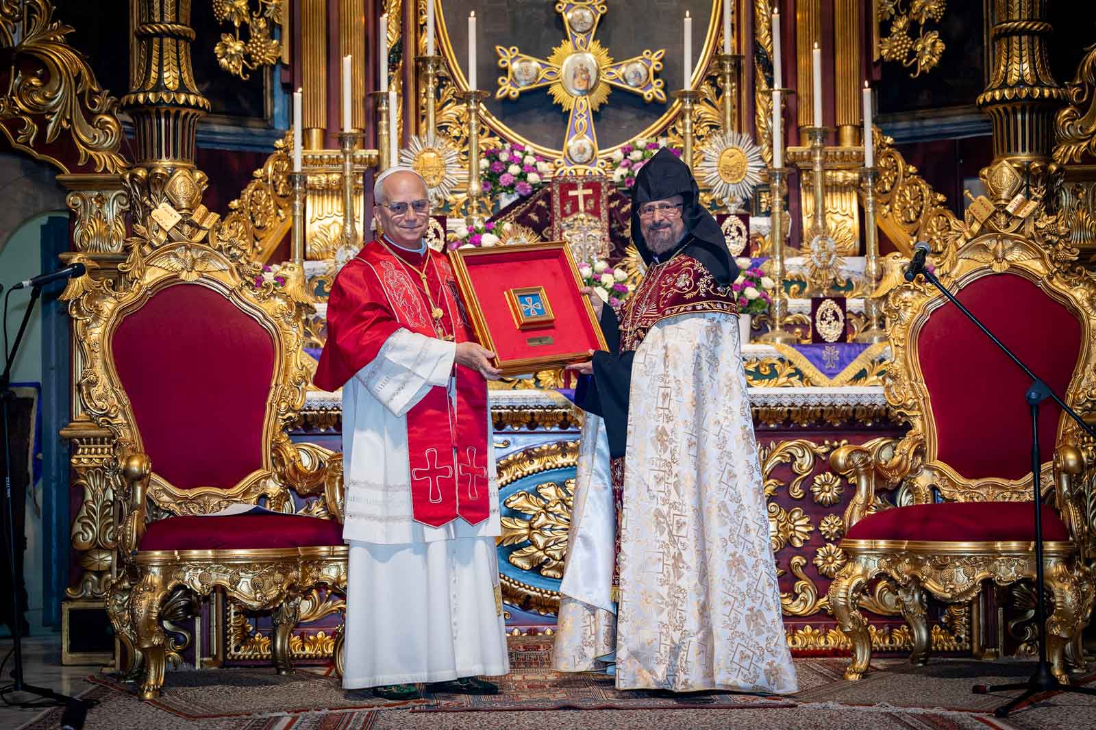 Սարկաւագներուն «Ողջոյն տուք միմեանց…»-էն ետք երկու հոգեւոր պետեր ողջագուրուեցան: